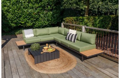 Die Lounge-Eckgarnitur Bari zeichnet sich durch ihr luxuriöses Aussehen aus. Der Aluminiumrahmen ist pulverbeschichtet und mit Polywood veredelt. Anstelle einer Armlehne verfügt dieses Lounge-Set über Beistelltische. Ideal, damit Sie immer einen Snack oder ein Getränk in Ihrer Nähe haben. Die Garnitur ist mit bequemen Kissen ausgestattet. Diese haben einen Außenstoff aus Olefin und eine Füllung aus Standardschaum. Das bedeutet, dass Sie die Kissen nicht im Freien liegen lassen können. Wir empfehlen, die Kissen nach dem Gebrauch zu lagern. Das Set wird mit einem Couchtisch geliefert.