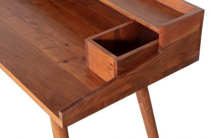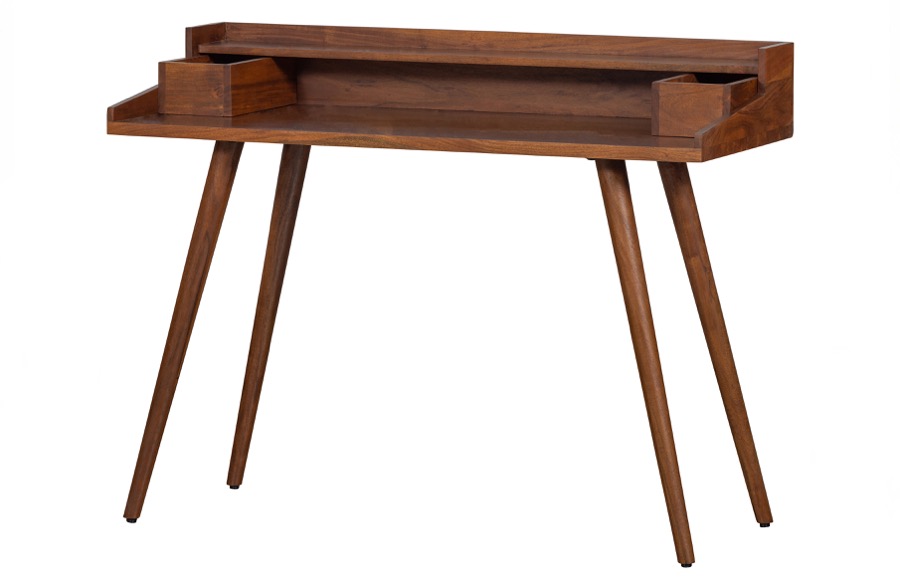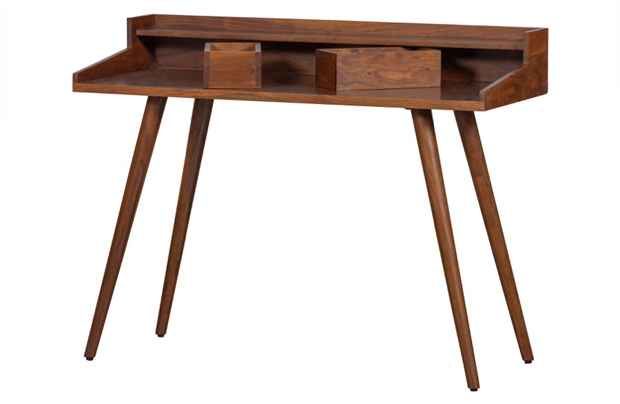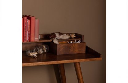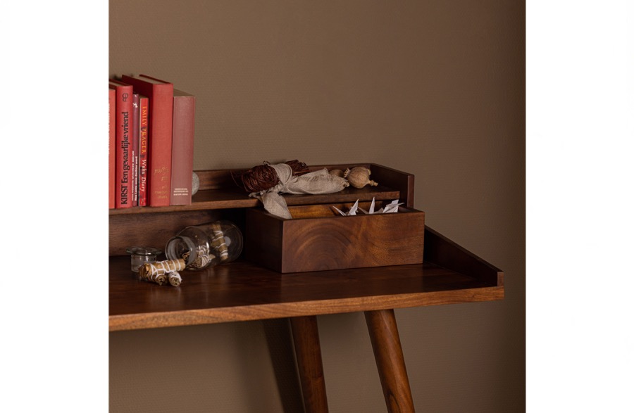 – Herrschaftlicher Schreibtisch mit Retro-Charakter – Hergestellt aus behandeltem Akazienholz – Praktisch: zwei zusätzliche, separate Zubehörablagen – H 90 cm x B 117 cm x T 50 cm Der Schreibtisch Brik aus der Kollektion der niederländischen Einrichtungsmarke Basiclabel ist ein idealer Ort für Hausaufgaben oder kreative Hobbys! Brik verfügt über eine großzügige Arbeitsfläche, eine praktische zusätzliche Ablage und zwei separate Fächer, die Sie flexibel verschieben können – praktisch für Stifte, Post-its oder Marker. Werden Sie produktiv mit Brik! WARNUNG Kippgefahr! Bei Möbeln, die höher als 70 cm sind, empfehlen wir, der Wandmontage besondere Aufmerksamkeit zu schenken. Die Fallschutzbefestigung verhindert Unfälle und bewahrt die Möbel vor dem Umkippen. Material Akazienholz zeichnet sich durch seine warme, rote Ausstrahlung aus. Diese Farbe wird durch Gebrauch und Lichteinwirkung etwas weicher. Die ausgeprägte Maserung und die Flammenzeichnung verleihen dieser dauerhaften Holzart viel Charakter. Farbnuancen, Unregelmäßigkeiten und Risse verleihen diesem Naturprodukt Tiefe und Charakter. Abmessungen – Höhe: 90 cm – Breite: 117 cm – Tiefe: 50 cm – Rahmenstärke: 1,5 cm – Regalbreite: 114 cm – Tiefe des Regals: 12 cm – Abstand zwischen Regal und Arbeitsplatte: 10 cm – Breite der Arbeitsplatte: 114 cm – Tiefe der Arbeitsfläche: 49 cm – Außenmaße von 2x separater Schublade HxBxT: 10x30x15 cm – Inhalt 2x separate Schublade HxBxT: 8,5x27x12 cm – Fußhöhe: 73,5 cm – Fußdurchmesser: ø 6/3 cm – Abstand zwischen den Vorderbeinen: 70/107 cm – Abstand der Seitenschenkel: 26/41 cm – Tragfähigkeit: 35 kg – Gewicht: 25 kg Wartung Gegenstände aus Akazienholz lassen sich leicht wöchentlich mit einem sauberen, trockenen Tuch reinigen. Für eine gründlichere Pflege kann das Akazienholz mit einem leicht feuchten Tuch mit lauwarmem Wasser abgewischt werden. Eine zusätzliche Behandlung ist mit einem speziellen Möbelöl möglich, das die wasserabweisende Wirkung der in dieser Holzart verborgenen natürlichen Öle verstärkt. Lieferung Der Schreibtisch wird in einem Paket geliefert und ist mit Hilfe der mitgelieferten Montageanleitung leicht zu montieren. Um Unfälle zu vermeiden, ist es ratsam, bei der Befestigung des Fallschutzes an der Wand besonders vorsichtig zu sein. Um harte Böden zu schützen, legen Sie Filzgleiter auf die Unterseite der Beine ø2 cm.