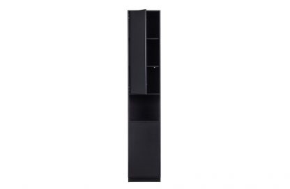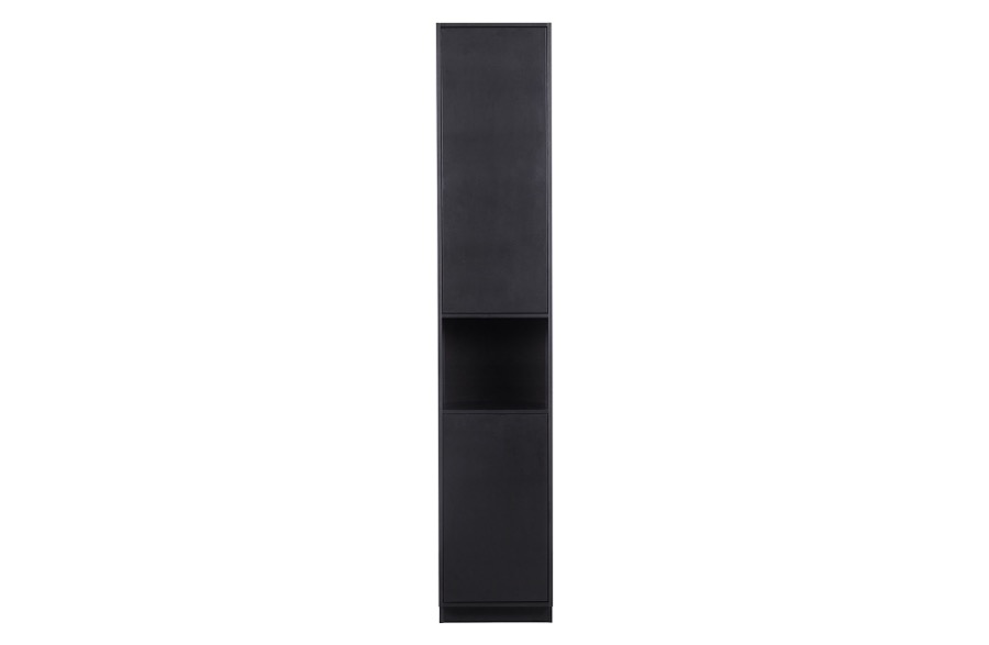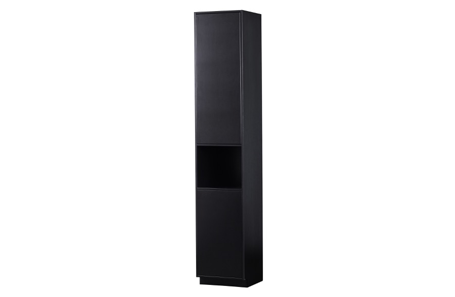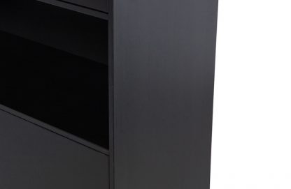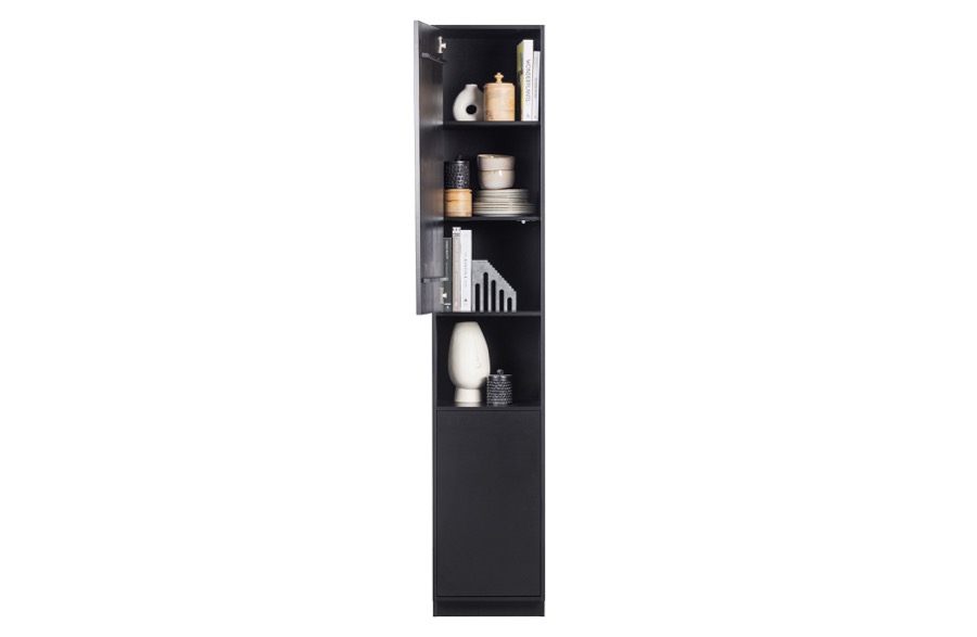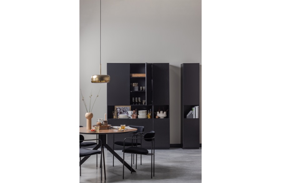 – Stilvolle Möbelserie in tiefem Schwarz – Mit modernem Push-to-Open-System – Hergestellt aus massivem Kiefernholz – H 210 cm x B 40 cm x T 40 cm Stilvoll, zeitlos und modern. Dies sind die Schlüsselwörter der Finca-Serie. Die Serie Finca stammt aus der Kollektion des niederländischen Einrichtungslabels WOOOD und ist aus natürlichem Kiefernholz gefertigt. Die Finca-Artikel sind mit einer matten, tiefschwarzen Beschichtung versehen. Die klaren Linien der Finca-Möbel werden nicht durch Griffe unterbrochen, ein modernes Push-to-Open-System ermöglicht das geräuschlose Öffnen und Schließen der Türen und Schubladen. Die 40 cm breite Anrichte Finca ist die schmale Version, die breite Anrichte ist eine 2-türige Anrichte mit einer Breite von 110 cm. Die obere Tür verdeckt drei praktische Ablagefächer. Darunter befindet sich ein offenes Fach, in dem Sie Ihre schönsten Dekorationen ausstellen können. Durch die untere Tür sind zwei weitere geräumige Ablagefächer nicht sichtbar. Die sechs Fächer sind jeweils 32 cm hoch, 38 cm breit und 37 cm tief. Die untere Kante des Sideboards lässt an der Vorderseite 7 cm Platz, wodurch das Möbelstück zu schweben scheint. Jedes Regal hat eine maximale Tragfähigkeit von 10 kg, wenn das Gewicht gleichmäßig verteilt ist. Jedes Möbelstück aus dem Finca-Möbelprogramm wird als einfacher Bausatz mit einer klaren Montageanleitung geliefert. Das Gleiten der Möbel kann auf harten Böden Kratzer verursachen, legen Sie zum Schutz Filzgleiter auf die Unterseite.