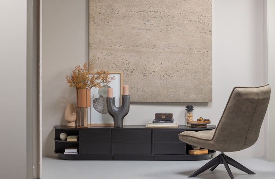 – Stilvolle Möbelserie in tiefem Schwarz – Mit modernem Push-to-Open-System – Hergestellt aus massivem Kiefernholz – H 40 cm x B 75 cm x T 40 cm Stilvoll, zeitlos und modern. Dies sind die Schlüsselwörter der Finca-Serie. Die Serie Finca stammt aus der Kollektion des niederländischen Einrichtungslabels WOOOD und ist aus natürlichem Kiefernholz gefertigt. Die Finca-Artikel sind mit einer matten, tiefschwarzen Beschichtung versehen. Die klaren Linien der Finca-Möbel werden nicht durch Griffe unterbrochen, ein modernes Push-to-Open-System ermöglicht das geräuschlose Öffnen und Schließen der Türen und Schubladen. Das TV-Möbel Finca ist mit einer Breite von 75 cm das Zwischenmaß der drei TV-Möbelvarianten. Sie sind 40 cm hoch und 39,5 cm tief. So lassen sich die drei Varianten leicht kombinieren und ein TV-Möbel in der gewünschten Größe einfach zusammenstellen. Das TV-Möbel hat zwei geräumige Schubladen mit einem Fassungsvermögen von je 11,5x68x30 cm HxBxT. Die Unterkante des Finca TV-Schrankes lässt vorne 7 cm Platz, wodurch der Eindruck entsteht, dass der TV-Schrank schwebt. Jede Schublade hat eine maximale Tragfähigkeit von 10 kg bei gleichmäßiger Gewichtsverteilung. Jedes Möbelstück aus dem Finca-Möbelprogramm wird als einfacher Bausatz mit einer klaren Montageanleitung geliefert. Das Gleiten der Möbel kann auf harten Böden Kratzer verursachen, legen Sie zum Schutz Filzgleiter auf die Unterseite.