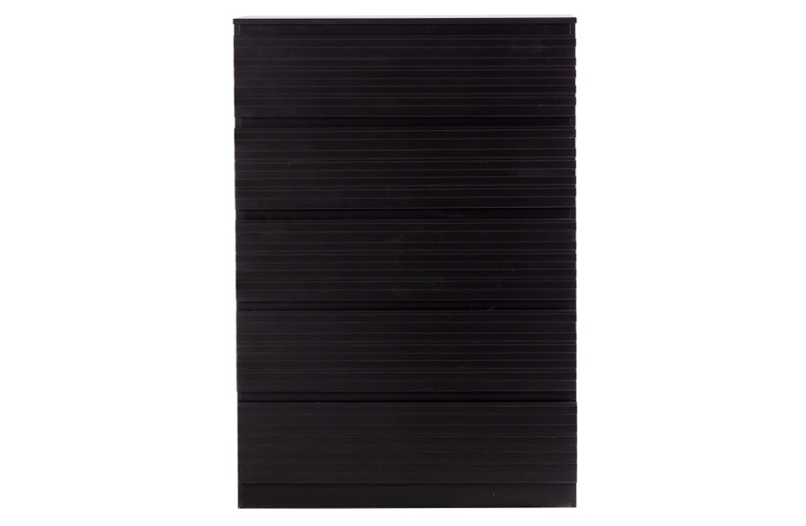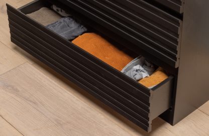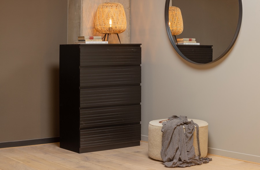 Einfache Kommode mit geprägten Schubladen Hergestellt aus Kiefernholz [FSC] mit mattschwarzer Beschichtung Mit sicherem Soft-Close-System H 120 cm x B 83 cm x T 46 cm Die Kommode Jente ist ein Muss für Sammler. Diese großzügige Kommode stammt aus der Kollektion des niederländischen Einrichtungslabels WOOOD und bietet mit ihren fünf Schubladen eine Fülle an verstecktem Stauraum. Die Kommode Jente ist aus stabilem, FSC-zertifiziertem Kiefernholz gefertigt und in einem tiefen Schwarz gehalten. Die fünf Schubladen sind mit einem leisen Soft-Close-System und einem unsichtbaren Griff ausgestattet. Die Kommode Jente ist 120 cm hoch, 83 cm breit und 46 cm hoch. Die fünf Schubladenfronten sind jeweils 20×83 cm HxB groß. In jeder Schublade ist Platz für 15x76x38 cm HxBxT. Die WOOOD-Kommode Jente wird als Bausatz mit einfacher Montageanleitung geliefert. Um harte Böden zu schützen, legen Sie Filzgleiter auf die Unterseite.