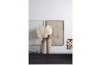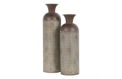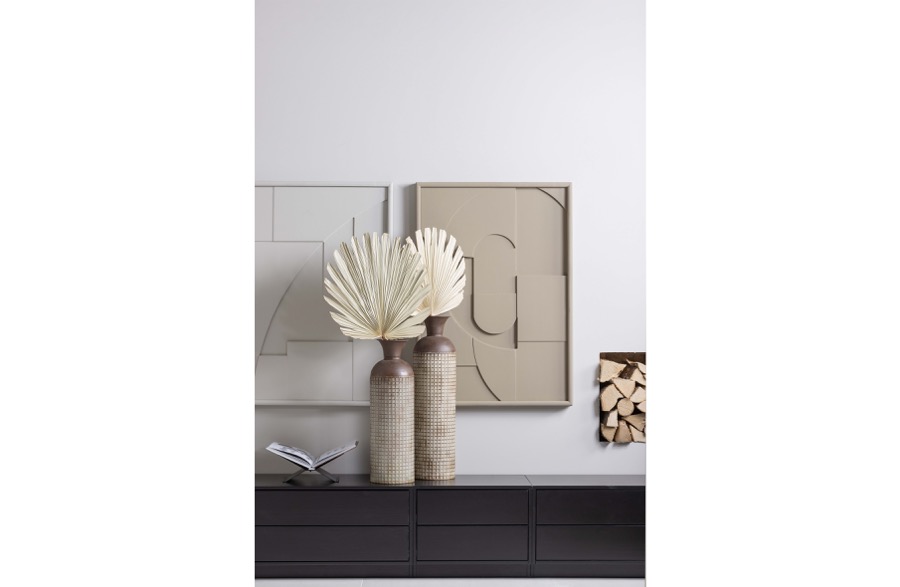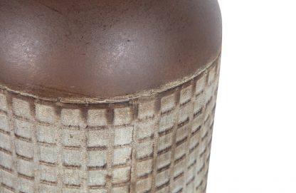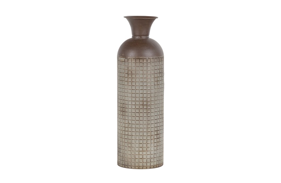Großzügige Präsentationsvase Hergestellt aus Metall mit Blockdruck Achtung: ist nicht wasserfest H 60 cm x ø 17 cm Diese großzügige Vase stammt aus der Kollektion der niederländischen Marke WOOOD. Die Vase Kari ist aus Metall mit einer verwitterten bräunlichen Beschichtung. Das Blockmuster verleiht der Vase einen robusten und lebendigen Look. Die Vase Kari ist 60 cm hoch. Die Vase hat einen Durchmesser von 17 cm, die Öffnung beträgt ø 13 cm und verjüngt sich trompetenförmig auf ø 7 cm. Das Blockmuster bedeckt die unteren 44 cm. Legen Sie zum Schutz des Bodens Filzgleiter auf die Unterseite. Bitte beachten Sie, dass die Vase Kari nicht wasserdicht ist. Damit eignet sich Kari perfekt für die Präsentation eines schönen Straußes aus Trockenblumen oder Zweigen. Die großzügige Vase Kari ist in zwei Größen erhältlich: L 60 cm und XL 70 cm.