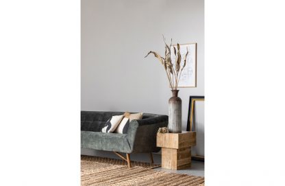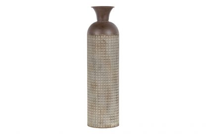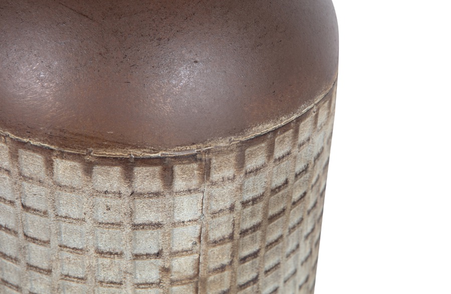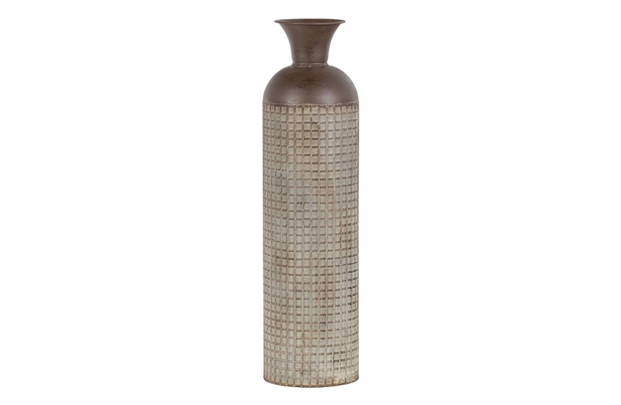 Großzügige Präsentationsvase Hergestellt aus Metall mit Blockdruck Achtung: ist nicht wasserfest H 70 cm x ø 19 cm Diese großzügige Vase stammt aus der Kollektion der niederländischen Marke WOOOD. Die Vase Kari ist aus Metall mit einer verwitterten bräunlichen Beschichtung. Das Blockmuster verleiht der Vase einen robusten und lebendigen Look. Die Vase Kari ist 70 cm hoch. Die Vase hat einen Durchmesser von 19 cm, die Öffnung ist ø 15 cm und verjüngt sich trompetenförmig auf ø 9 cm. Das Blockmuster bedeckt die unteren 54 cm. Legen Sie zum Schutz des Bodens Filzgleiter auf die Unterseite. Bitte beachten Sie, dass die Vase Kari nicht wasserdicht ist. Damit eignet sich Kari perfekt für die Präsentation eines schönen Straußes aus Trockenblumen oder Zweigen. Die großzügige Vase Kari ist in zwei Größen erhältlich: L 60 cm und XL 70 cm.