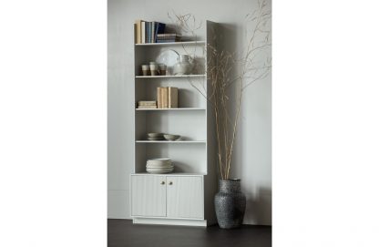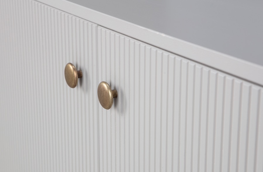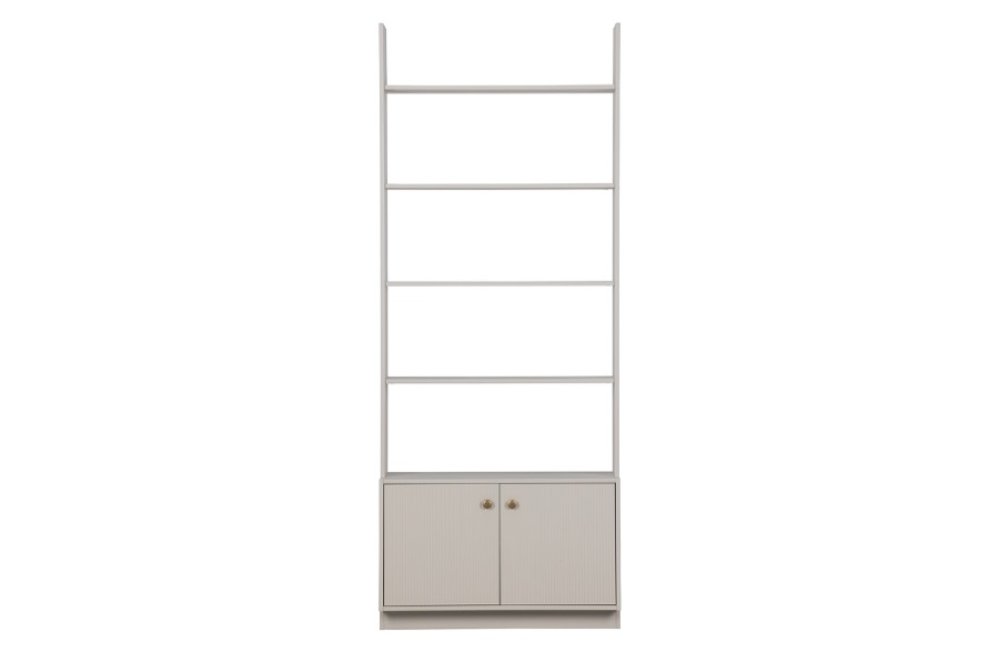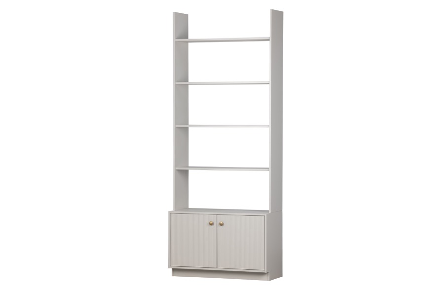 Stilvolles offenes Bücherregal Kombination aus Kiefernholz und Metall Viel Stauraum: mit 4 Einlegeböden H 200 cm x B 79,6 cm x T 35 cm Madu ist ein stilvolles, modernes Bücherregal aus der Kollektion der niederländischen Marke WOOOD. Madu ist aus Kiefernholz mit wolkengrauer Lackierung gefertigt. Dadurch erhält der Schrank ein zeitloses Aussehen. Die goldfarbenen Knöpfe in Kombination mit dem hellen Kiefernholz verleihen dem Schrank zudem einen modernen und robusten Charakter. Die offenen Regale an der Oberseite bieten Platz für die Präsentation von Zubehör. Madu hat zwei Türen mit goldfarbenen Knöpfen. Hinter diesen Türen befinden sich 2 Einlegeböden. Die Zwischenräume haben eine Breite von 75 cm und eine Tiefe von 33 cm. Für harte Böden verwenden Sie Filzgleiter an der Unterseite. Dadurch wird eine Beschädigung des Bodens verhindert. Der Artikel wird als einfacher Bausatz mit übersichtlicher Montageanleitung geliefert.
