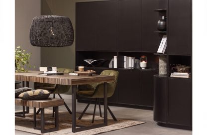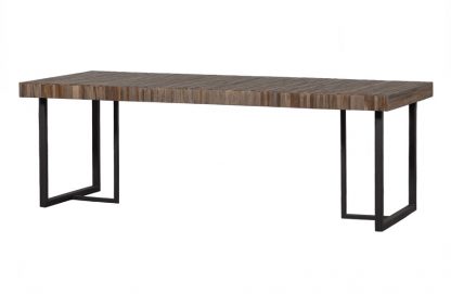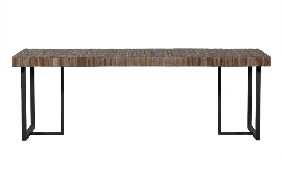 – Stilvoller Esstisch mit stabilen Holzarbeiten – Tischplatte aus recyceltem Teakholz – Jeder Artikel ist einzigartig! – H 76 cm x B 200 cm x T 90 cm Eine widerstandsfähige und robuste Tischplatte auf einem schlanken, mattschwarzen Fußgestell. Diese stilvolle Kombination finden Sie in der Serie Maxime aus der Exclusive-Kollektion der niederländischen Einrichtungsmarke WOOOD. Das Holz der Maxime-Artikel ist recyceltes Teakholz mit rauer Optik und warmer Färbung. Das charakteristische Aussehen des recycelten Holzes verleiht jedem Artikel einzigartige Eigenschaften. Material Teak ist ein tropisches Hartholz und eine sehr dauerhafte Holzart. Teakholz selbst hat eine dunkelbraune/rote Farbe, die sehr luxuriös aussieht. Teakholz zeichnet sich durch eine enge, gerade Maserung aus und ist daher sehr gut für die Verarbeitung geeignet. Bei der Verwendung im Freien kann es jedoch zu Verfärbungen oder Haarrissen im Holz kommen. Dies hat keinen Einfluss auf die Konstruktion. Abmessungen – Höhe: 76 cm – Breite: 200 cm – Tiefe: 90 cm – Obere Höhe: 8,5 cm – Dicke der Oberseite: 2 cm – Fußhöhe: 74 cm – Rahmenstärke: 3,5×4 cm / 2,5×2 cm – Fußtiefe: 70 cm – Abstand zwischen den Beinen: 180 / 119 cm – Tragfähigkeit: 150 kg – Gewicht: 29 kg Wartung Um Teakholzmöbel im Freien in optimalem Zustand zu halten, ist es ratsam, sie regelmäßig mit den entsprechenden Pflegemitteln zu pflegen; lassen Sie sich am besten von einem Fachmann beraten. Reinigen Sie Teakholz nicht mit zu viel Wasser, da sich sonst die Holzfasern aufrichten und die Möbel sehr rau werden. Lieferung Der Artikel wird in einem Paket geliefert und ist mit Hilfe der mitgelieferten Montageanleitung leicht zu montieren. Legen Sie Filzgleiter auf die Unterseite der Beine, um Schäden an harten Böden zu vermeiden.