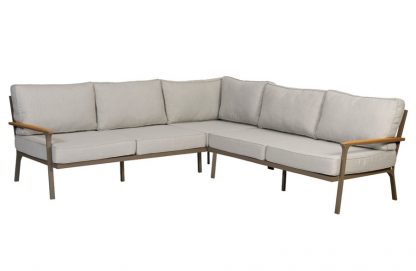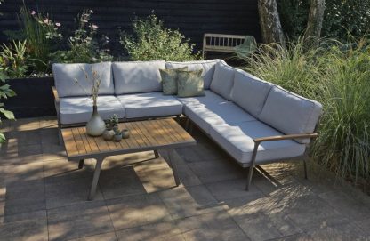 Entspannen Sie sich in der komfortablen Eckgarnitur Orlando. Diese Garnitur hat einen Aluminiumrahmen und ist mit Armlehnen aus FSC®-Teakholz ausgestattet. Die Eckgarnitur verfügt über schöne und bequeme Kissen mit einem Oberstoff aus Olefin und einer schnell trocknenden Schaumstofffüllung. Dieser Schaumstoff ist wasserdurchlässig, schimmel- und verrottungsfest. Sie können die Garnitur also getrost die ganze Gartensaison über draußen stehen lassen. Lagern Sie die Kissen oder legen Sie sie bei starkem Regen schräg ab. Um das Trocknen nach einem Regenschauer zu beschleunigen, können die Elemente vor der Benutzung mit einem trockenen Tuch abgewischt werden. Teakholz ist ein Naturprodukt, das sich durch verschiedene Witterungseinflüsse verfärben und Haarrisse bilden kann. Die Konstruktion wird dadurch nicht beeinträchtigt.