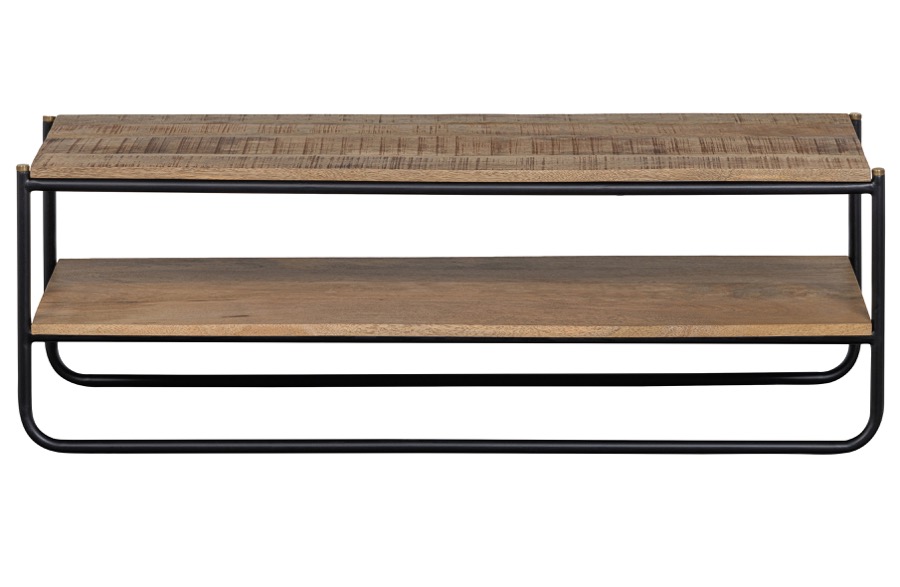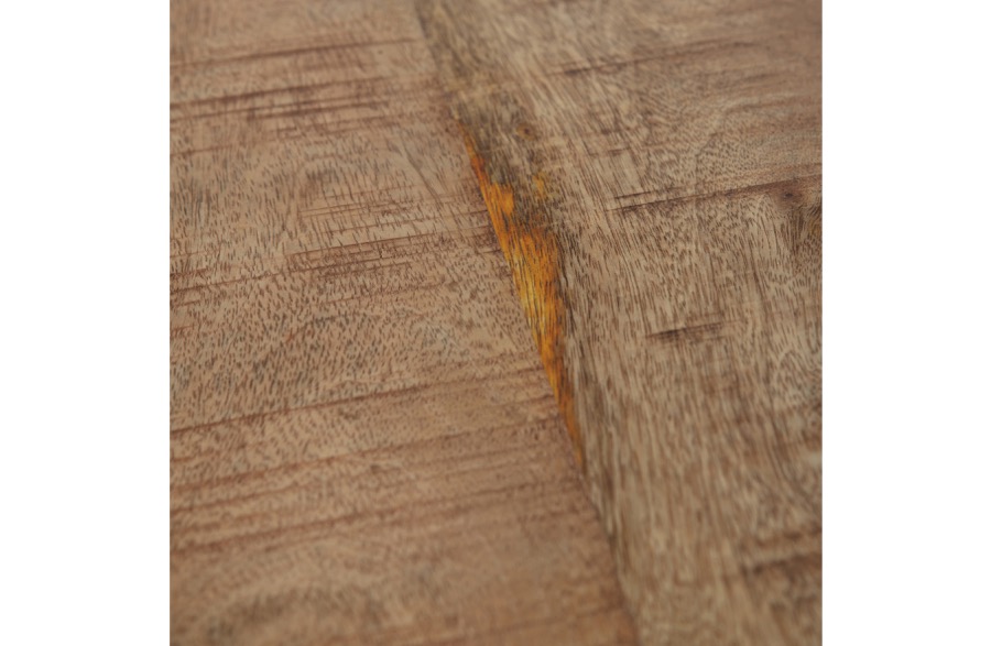 – Stabiler Couchtisch von großzügiger Größe – Bretter aus grob gesägtem Mangoholz – Metallgestell mit mattschwarzer Pulverbeschichtung – H 40 cm x B 120 cm x T 51 cm Der Couchtisch Rikkie ist ein robustes Stück aus der Kollektion der niederländischen Einrichtungsmarke WOOOD. Rikkie zeichnet sich durch das grob gesägte Mangoholz auf der Oberseite und das schlanke schwarze Metallgestell aus. Der warme grau-rote Farbton des Mangoholzes verleiht der Sitzfläche viel Atmosphäre und die großzügige Platte bietet genügend Platz für ein schickes Dekostück und Ihr Lieblingsgetränk und -snack. Material Mangoholz ist bekannt für seine warme goldbraune Farbe, sein nachhaltiges Wachstum und seine lange Haltbarkeit. Mangoholz zeichnet sich außerdem durch eine deutlich sichtbare Maserung und Farbnuancen aus. Die Maserung, der gelbe Schimmer oder die dunklen Linien und Äste machen jeden Gegenstand aus Mangoholz einzigartig. Mangoholz ist sehr stark und gehört zu den härteren Hölzern, weshalb ein Gegenstand aus Mangoholz nicht so leicht beschädigt werden kann. Abmessungen – Höhe: 40 cm – Breite: 120 cm – Tiefe: 51 cm – Dicke der Einlegeböden: 1,5 cm – Breite der Einlegeböden: 51 cm – Länge der Regale: 117 cm Der obere Boden ist grob gesägt, der untere Boden ist glatt geschliffen. – Rahmenstärke: Ø1,5 cm – Abstand dazwischen: 17 cm – Platz darunter: 15 cm – Max. Gewichtskapazität pro Fachboden: 15 kg Wartung Möbel aus Mangoholz sind leicht zu pflegen. Mit einem leicht feuchten, sauberen Tuch können Sie sie leicht staub- und fleckenfrei halten. Gegenstände aus Mangoholz sind nur für den Gebrauch in Innenräumen bestimmt. Eine zusätzliche Behandlung oder ein zusätzlicher Schutz ist mit einer transparenten Beschichtung möglich, wird aber in den ersten Jahren nicht als notwendig erachtet. Lassen Sie sich in jedem Fall von einem Lackierbetrieb beraten und informieren Sie sich über die Behandlung des Mangoholzartikels. Lieferung Der Couchtisch wird stückweise geliefert und ist mit Hilfe der beiliegenden Montageanleitung leicht zu montieren. Rikkie ist nur für den Gebrauch in Innenräumen geeignet. Um harte Böden zu schützen, legen Sie Filzgleiter an die Unterseite des Rahmens.