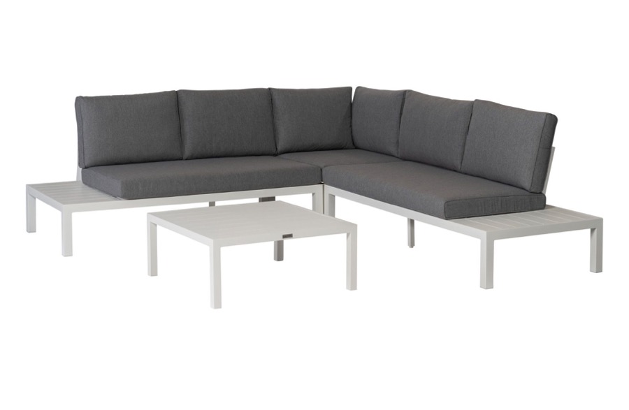 Der Aluminiumrahmen verleiht der La Vida-Eckgarnitur von Exotan ein schlichtes Design. Aluminium ist witterungsbeständig und pflegeleicht. Das Set besteht aus einem Couchtisch und drei separaten Elementen, die sich leicht miteinander verbinden lassen. Das Gestell ist mit schönen Kissen ausgestattet. Diese sind aus einem robusten Olefin-Außenstoff mit einer Füllung aus Standardschaumstoff gefertigt. Das bedeutet, dass Sie die Kissen nicht im Freien liegen lassen können. Lagern Sie diese Kissen immer an einem trockenen Ort und vor Sonnenlicht geschützt. Dadurch wird verhindert, dass “das Wetter” oder Schimmel in die Kissen eindringt. Sie können dieses Loungeset auch mit einem Zwischenelement erweitern. Dieses Loungeset ist auch mit einem Aluminiumrahmen mit Teakholz FSC® 100% erhältlich.