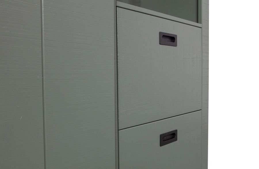 Dieser Slide Barn ist alles andere als ein normales Lager- oder Bücherregal. Die Scheune ist ein Schrank mit Möglichkeiten. Sie können es selbst interpretieren. Der Schrank hat über zwei Seiten verteilt zwei dicke Einlegeböden und unten 2 Schubladen, wobei eine Seite immer sichtbar und die andere Seite durch eine Schiebetür verdeckt ist. Die Schiebetür in der Metallschiene kann daher von rechts nach links geschoben werden. Der Schrank ist aus massivem, FSC-zertifiziertem Kiefernholz gefertigt und das verwendete Holz ist sägerau. Grob gesägtes Holz Dieses Möbelstück wurde aus grob gesägtem Holz gefertigt. Das bedeutet, dass das Holz kreuzweise gesägt wurde, wodurch es ein rustikales, geschliffenes Aussehen erhält. Dies verleiht den Möbeln einen gealterten Vintage-Look. Durch diesen Vorgang können Unregelmäßigkeiten und kleine Risse besser sichtbar sein. Dies sind Merkmale von sägerauem Holz. Jedes Stück ist daher ein Unikat! Hinweis: Der Schrank hat eine Höhe von 230 cm, da die Beschläge etwas darüber liegen, beträgt die Gesamthöhe 232 cm. Der Schrank wird als Bausatz mit einer übersichtlichen Montageanleitung geliefert.