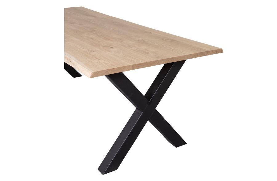 Natürlich geformter Baumstammtisch Massive unbehandelte Eiche Mit Metallfuß Alkmaar H 75 cm x B 220 cm x T 90 cm Der Eiche fsc Baumstamm-Tisch Tablo von WOOOD hat eine robuste und widerstandsfähige Optik. Die Kanten an der Längsseite der Baumstamm-Tischplatte haben ihre ursprünglichen Konturen behalten. Das macht jedes Blatt einzigartig und zu einem echten Blickfang. Bitte beachten Sie: Diese Tischplatte aus massiver Eiche ist 220 cm lang, 90 cm breit und 3 cm dick. Unebenheiten, Risse und Äste sind bei diesem Naturprodukt vorprogrammiert. Der Tablo Alkmaar HxBxT 72x79x10 cm, besteht aus 80x80x1 mm Stahlrohr, KD-Struktur und ist mattschwarz pulverbeschichtet. Dieses Tischbein wiegt 9,3 kg. Dieser Tisch hat ein Gesamtgewicht von 47,6 KG und eine Tragfähigkeit von 150 KG. Der Tisch wird in drei Paketen geliefert und ist mit Hilfe der einfachen Montageanleitung leicht zu montieren.