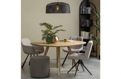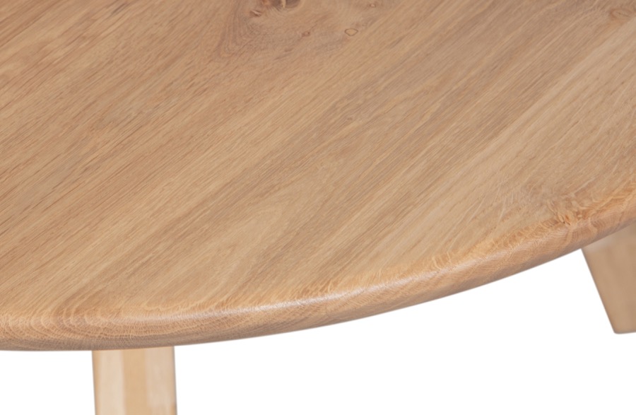 – Verspielter Esstisch mit organischer Form – Tischplatte in Eiche natur, geschliffen, durchgehend gestreift – Rahmen aus unbehandelter, fsc-zertifizierter Eiche – H 75 cm x B 130 cm x T 130 cm Gestalten Sie Ihren idealen Essbereich mit den Elementen aus der Tablo-Serie der niederländischen Einrichtungsmarke WOOOD. Tablo bietet viele Kombinationsmöglichkeiten und verschiedene Größen an, um Ihren Essbereich passgenau einzurichten. Wählen Sie zum Beispiel diese organisch geformte Variante mit dem vielseitigen dreibeinigen Fuß für einen spielerischen Effekt. Material Eichenholz zeichnet sich durch seine hellbraune Färbung mit einem sanften gelben Schimmer und einer deutlich sichtbaren Maserung aus. Eichenholz trocknet im Allgemeinen sehr langsam, was zu einem natürlichen Prozess der Rissbildung und Verfärbung führen kann. Eiche ist ein Naturprodukt, das eine sichtbare Bühne verdient. Deshalb verwenden wir ausschließlich Lacke und Beschichtungen auf natürlicher Basis, die die Maserung und die natürlichen Eigenschaften der Eiche zur Geltung bringen. Das Eichenholz in unseren Kollektionen ist immer zu 100% FSC-zertifiziert. Abmessungen Die organisch geformte Tischplatte aus Eichenholz hat eine Stärke von 2,2 cm und ist an der breitesten und tiefsten Stelle 130 cm lang. Der Tablo 3-Fuß hat eine Höhe von 72 cm, eine Breite von 79 cm und eine Tiefe von 10 cm. Die Montageplatte ist 1,8 cm dick und hat 12 Befestigungslöcher für drei verschiedene Montagemöglichkeiten. Wartung Der Sockel dieser Eichenmöbel ist unbehandelt. Achten Sie darauf, dass Sie die Beine gründlich mit einem Finish nach Ihrem Geschmack behandeln. Die Tischplatte wurde mit einem extra-matten 2-Komponenten-Lack behandelt, der eine Kombination aus Lack und Härter ist. Die Tischplatte muss nicht zusätzlich behandelt werden. Farbveränderungen sind möglich, in diesem Fall empfiehlt es sich jedoch, die Möbel gut zu entfetten, mit 280er Schleifpapier gründlich zu schleifen und staubfrei zu machen. Danach kann die gewünschte Farbe auf das Möbelstück aufgetragen werden. Behandeltes Eichenholz ist sehr leicht zu pflegen. Halten Sie die Möbel regelmäßig mit einem sauberen, trockenen Tuch staubfrei. Entfernen Sie feuchte Flecken sofort mit einem leicht angefeuchteten Tuch und einem neutralen Reinigungsmittel und lassen Sie das Holz an der Luft trocknen. Verwenden Sie immer die grundlegenden Schutzmaßnahmen für Holz, wie z. B. die Verwendung eines Untersetzers unter einem Trinkglas oder einer heißen Pfanne. Lieferung Die Combi-Tablo-Pakete werden separat geliefert und lassen sich anhand der mitgelieferten Montageanleitung leicht zusammenbauen. Der 3-Fuß wird paarweise geliefert und kann dank mehrerer Löcher in der Montageplatte in drei verschiedenen Positionen unter der Tablo-Tischplatte montiert werden. Um harte Böden zu schützen, legen Sie Filzgleiter auf die Unterseite der Beine.
