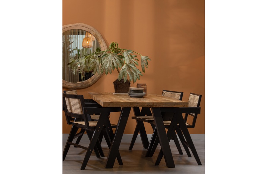 – Stilvoller Esstisch mit robuster Tischplatte – Tischplatte aus natürlichem Mangoholz-Mix – Sockel aus Metall mit mattschwarzer Pulverbeschichtung – H 75 cm x B 180 cm x T 90 cm Gestalten Sie Ihren idealen Essbereich mit den Elementen aus der Tablo-Serie der niederländischen Einrichtungsmarke WOOOD. Tablo bietet viele Kombinationsmöglichkeiten und verschiedene Größen an, um Ihren Essbereich genau so einzurichten, wie Sie es wünschen. Wählen Sie zum Beispiel diese schlichte Variante aus Mangoholz mit dem schlanken Utrecht-Bein für einen zeitlosen Effekt. Material Mangoholz ist bekannt für seine warme, goldbraune Farbe, sein beständiges Wachstum und seine lange Lebensdauer. Auch Mangoholz zeichnet sich durch deutlich sichtbare Maserungen und Farbnuancen aus. Die Maserung, der gelbe Schimmer oder die dunklen Linien und Äste machen jedes Stück Mangoholz zu einem Unikat. Da Mangoholz sehr stark ist und zu den härteren Hölzern gehört, kann ein Gegenstand aus Mangoholz nicht so leicht beschädigt werden. Das Metall in unseren Kollektionen hat verschiedene Oberflächen, wie z.B. Pulverbeschichtung und Messing/Antikmessing. Eine Pulverbeschichtung sorgt für ein luxuriöses, mattes Aussehen und schützt das Metall für die gesamte Lebensdauer. Die Pulverbeschichtung ist ein Lack, der bei hohen Temperaturen auf das Metall aufgebracht wird. Abmessungen – Höhe: 75 cm – Breite: 180 cm – Tiefe: 90 cm – Dicke der Tischplatte: 5 cm – Fußhöhe: 72 cm – Beinbreite: 10 cm – Beintiefe: 79 cm – Gewicht: 55,5 kg – Maximale Belastung: 150 kg Wartung Möbel aus Mangoholz sind leicht zu pflegen. Mit einem leicht feuchten, sauberen Tuch können Sie sie leicht staub- und fleckenfrei halten. Gegenstände aus Mangoholz sind nur für den Gebrauch in Innenräumen bestimmt. Eine zusätzliche Behandlung oder ein zusätzlicher Schutz ist mit einer transparenten Beschichtung möglich, wird aber in den ersten Jahren nicht als notwendig erachtet. Lassen Sie sich bei der Behandlung von Mangoholz immer von einem Lackierfachmann beraten und informieren. Alle unsere Metalle in der Sammlung sind gründlich behandelt worden und müssen daher nicht erneut behandelt werden. Sollte das Metall beschädigt sein, wenden Sie sich an einen Lackierfachbetrieb. Behandeltes Metall lässt sich mit einem leicht angefeuchteten Tuch und einem milden Reinigungsmittel leicht sauber halten. Lieferung Die Combi-Tablo-Pakete werden separat geliefert und sind mit Hilfe der mitgelieferten Montageanleitung leicht zu montieren. Das Bein Utrecht wird separat geliefert und lässt sich dank des Bohrbildes leicht unter der Tablo-Tischplatte montieren. Um harte Böden zu schützen, legen Sie Filzgleiter auf die Unterseite der Beine.
