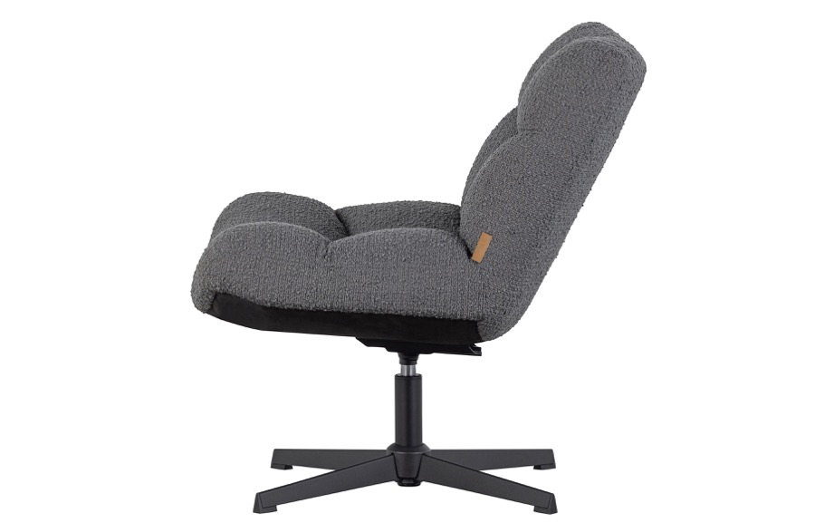 – Bequemer Drehstuhl – Gepolstert mit weichem Bouclé 100% Polyester – Stabiler Metallfuß in Schwarz – H 80 cm x B 75 cm x T 75 cm Mit diesem Vinny-Drehstuhl der niederländischen Marke WOOOD holen Sie sich einen herrlich bequemen Sitz in Ihr Zuhause. Der Vinny-Drehstuhl ist ein echter Blickfang, der sich problemlos in jeden Einrichtungsstil einfügt. Die leicht niedrige Rückenlehne sorgt dafür, dass Vinny kompakt wirkt und ein großzügiges Blickfeld im Wohnbereich bewahrt. Dieser kuschelige Sessel ist in verschiedenen Farben erhältlich. Material Vinny ist mit dem superweichen Bouclé-Stoff Cres gepolstert. Die Zusammensetzung aus 100% Polyester macht den Drehstuhl sehr pflegeleicht. Der Vinny hat einen schwarzen Metallsockel mit vier Beinen und ein leichtgängiges Drehsystem. Die Polyurethanschaum-Füllung hat einen hohen Sitzkomfort und ist daher perfekt für einen Moment des Genusses mit einem guten Buch! Abmessungen Der Vinny-Drehstuhl hat eine Gesamthöhe von 80 cm, die breiteste und tiefste Stelle misst 75 cm. Die Sitzhöhe beträgt 48 cm und die Sitztiefe 52 cm, da fällt das Faulenzen leicht! Die Sitzbreite beträgt 75 cm, die Rückenlehne ist 32 cm hoch und 12 cm dick. Der Metallsockel ist 28 cm hoch und 51 cm breit und tief, das Drehsystem hat einen Durchmesser von 6 cm und jedes Bein hat eine Länge von 34 cm. Der Drehstuhl hat eine maximale Tragfähigkeit von 120 kg. Wartung Der Stoff ist durch regelmäßiges Staubsaugen mit einer Möbelbürste leicht sauber zu halten. Flecken? Vorsichtig mit einem leicht feuchten Tuch abtupfen. Eine Imprägnierung wird nicht empfohlen. Lieferung Um harte Böden zu schützen, legen Sie Filzgleiter unter die Beine. Der Vinny wird als einfacher Bausatz mit einer klaren Montageanleitung geliefert.